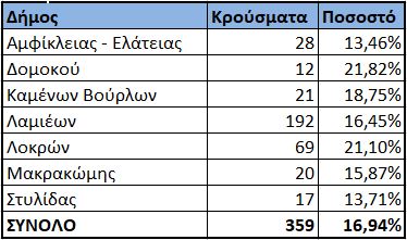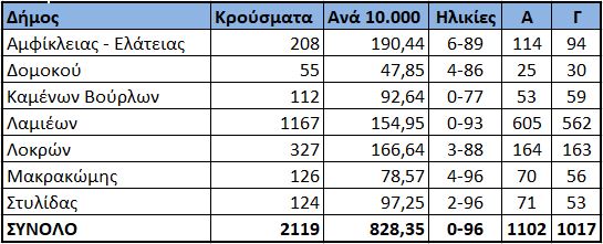 Στον παρακάτω πίνακα έχουμε καταγράψει τα παραπάνω κρούσματα για τους Δήμους της Φθιώτιδας, κάνοντας και την αναγωγή ανά 10.000 κατοίκους με διαχωρισμό ανδρών - γυναικών και το ηλικιακό εύρος.