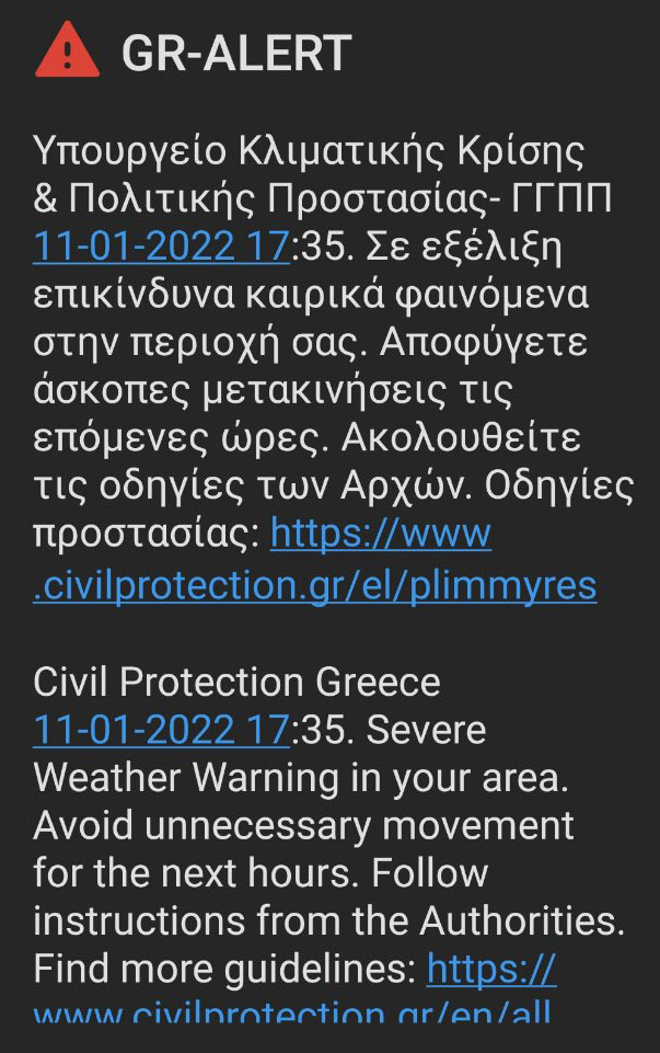 Μήνυμα μέσω του «112» εστάλη για μία ακόμη φορά από το Υπουργείο Πολιτικής Κρίσης και Πολιτικής Προστασίας - ΓΓΠΠ προς τους κατοίκους της Κεντρικής Ελλάδας και συγκεκριμένα στις 17:35, προκειμένου να αποφύγουν τις άσκοπες μετακινήσεις.