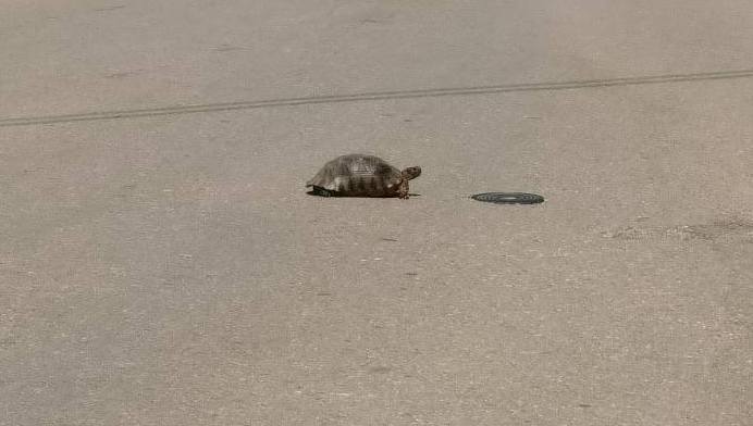 Μία χελώνα λοιπόν προσπαθούσε να διασχίσει την οδό Ερυθρού Σταυρού, «ξεγλιστρώντας» από τα αυτοκίνητα!