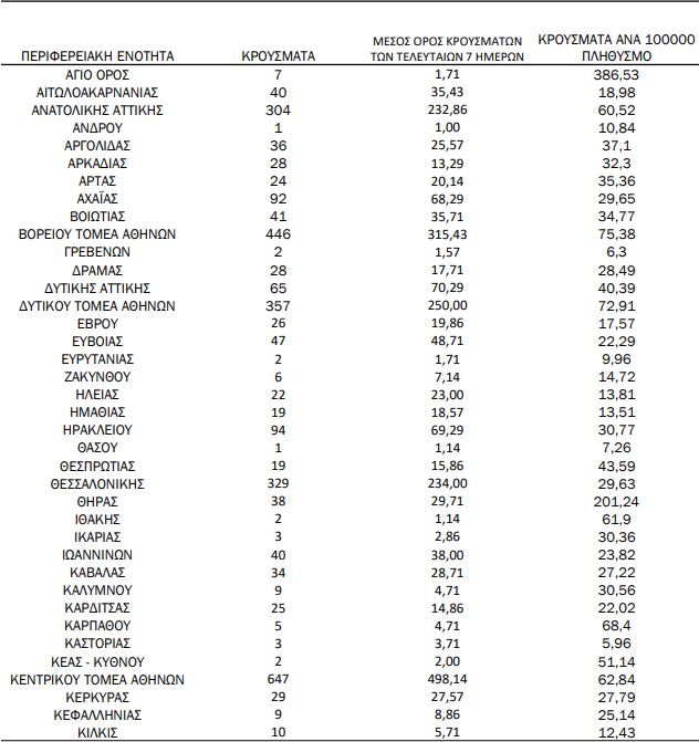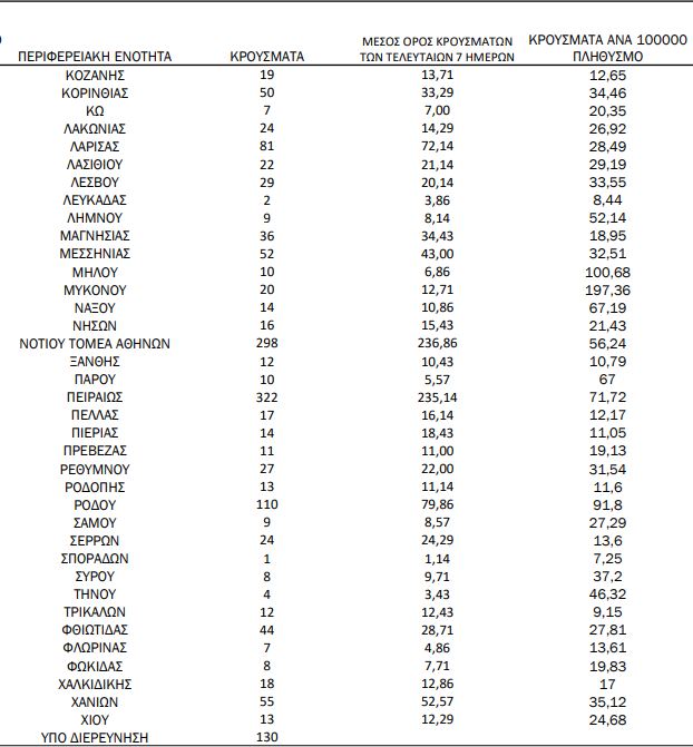 Εύβοια, Φθιώτιδα και Βοιωτία «χρεώνονται με 47, 44 και 41 κρούσματα αντίστοιχα.