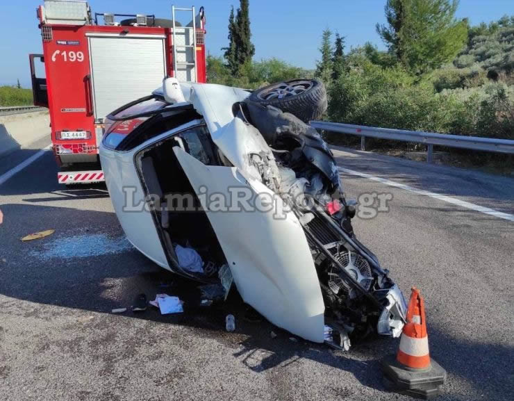 Κάτω από άγνωστες συνθήκες το αυτοκίνητο χτύπησε στο τσιμεντένιο διάζωμα και στη συνέχεια τούμπαρε, μέσα στην εθνική οδό, καταλήγοντας όπως το βλέπετε στις φωτογραφίες του LamiaReport.