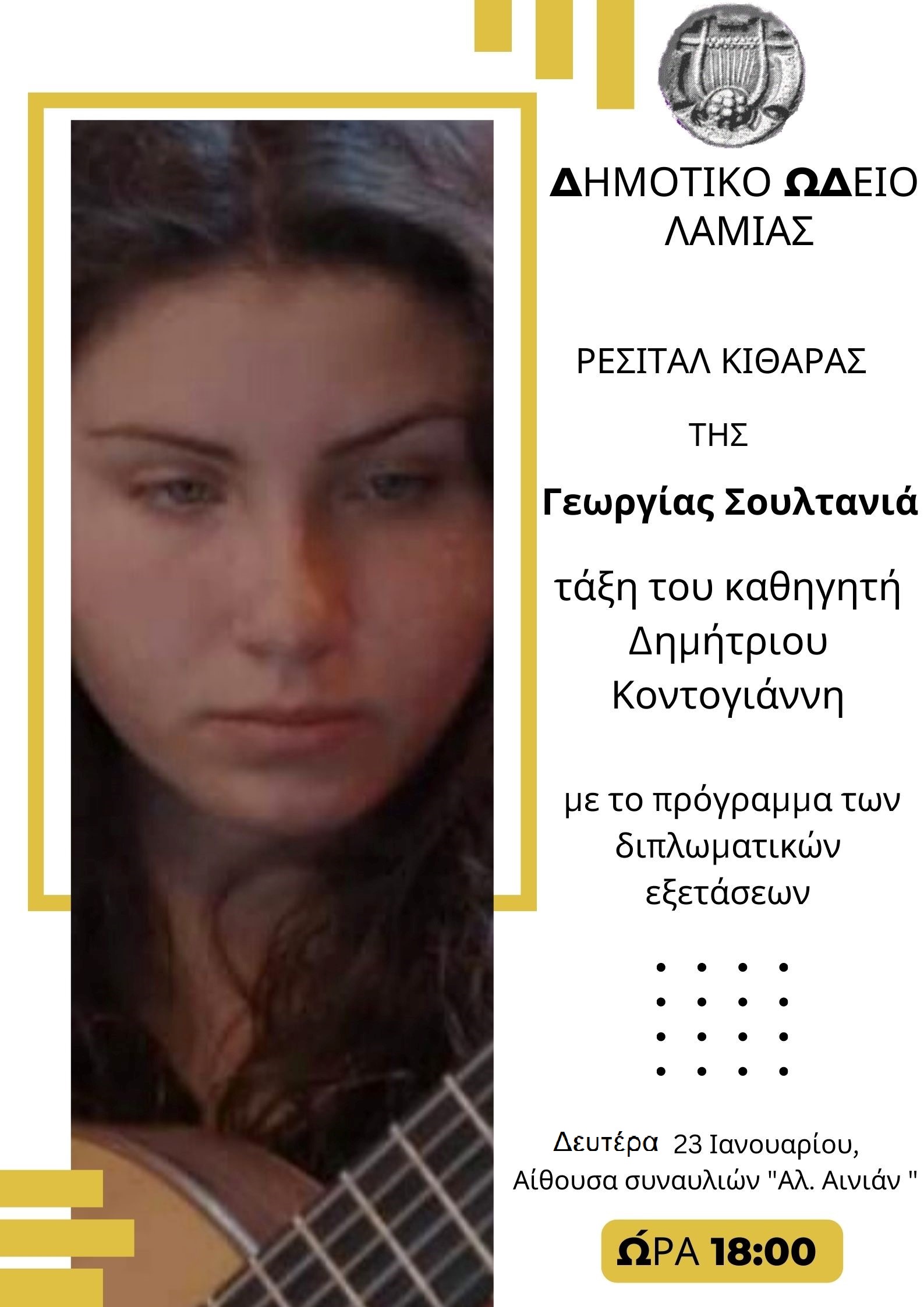 - Γεωργίας Σουλτανιά (τάξη καθηγητή κ. Δημητρίου Κοντογιάννη), την Δευτέρα 23 Ιανουαρίου 2023 και ώρα 6.00 το απόγευμα στην αίθουσα Συναυλιών «Αλέξ.Αινιάν» του Δημοτικού Ωδείου Λαμίας