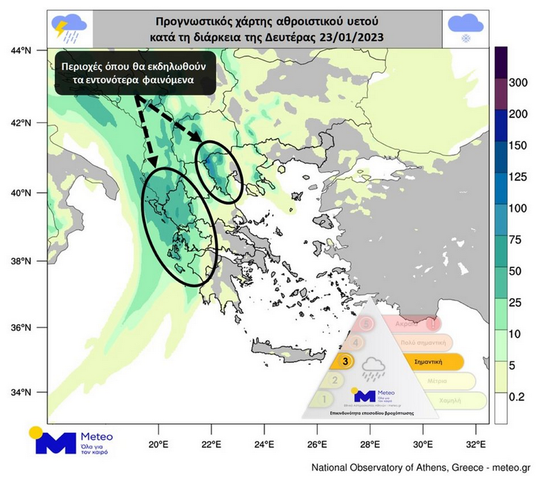 Στον προγνωστικό χάρτη που ακολουθεί απεικονίζεταιο εκτιμώμενος αθροιστικός υετός (βροχές/χιόνια) έως το τέλος της ημέρας και σημειώνονται οι περιοχές των ισχυρότερων φαινομένων: