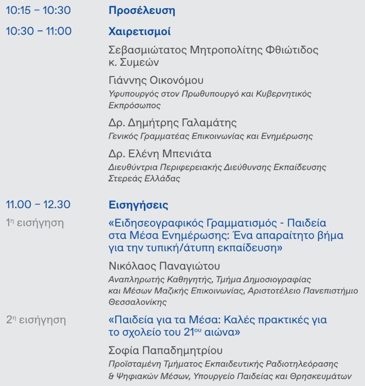 Η Γενική Γραμματεία Επικοινωνίας και Ενημέρωσης διοργανώνει ημερίδα με θέμα «Παιδεία στα Μέσα» σε συνεργασία με την Ιερά Μητρόπολη Φθιώτιδας, στο πλαίσιο των εκδηλώσεων της Ιεράς Μητροπόλεως για την εορτή των Τριών Ιεραρχών και με τη συμβολή της Περιφερειακής Διεύθυνσης Στερεάς Ελλάδας και των Διευθύνσεων Πρωτοβάθμιας και Δευτεροβάθμιας Εκπαίδευσης Ν. Φθιώτιδας, με τη συμμετοχή του Σεβασμιωτάτου Μητροπολίτη Φθιώτιδος κ. Συμεών, του