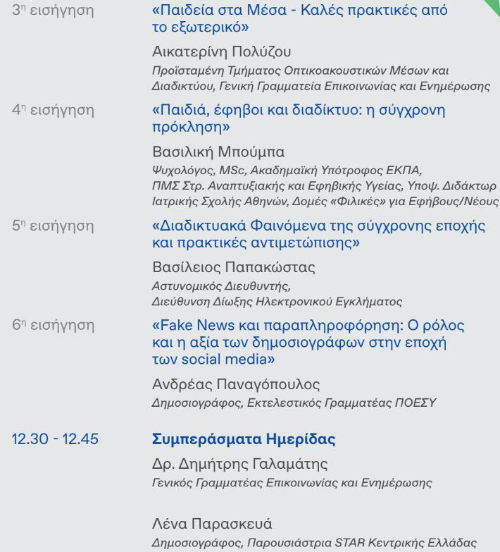 H δεύτερη εισήγηση έχει θέμα «Παιδεία για τα Μέσα: Καλές πρακτικές για το σχολείο του 21ου αιώνα» και εισηγητής είναι η Προϊσταμένη Τμήματος Εκπαιδευτικής Ραδιοτηλεόρασης & Ψηφιακών Μέσων του Υπουργείου Παιδείας