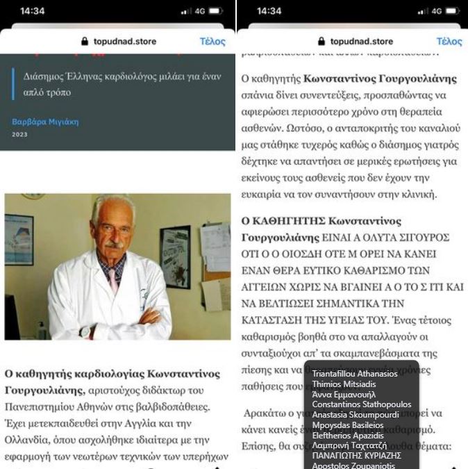 Τελευταία περίπτωση η χρησιμοποίηση του ονόματος του γνωστού Διευθυντή της Πνευμονολογικής Κλινικής του Πανεπιστημιακού Νοσοκομείου της Λάρισας Κωνσταντίνου Γουργουλιάνη, τον οποίο για τις ανάγκες της κομπίνας τους τον παρουσίασαν ως καρδιολόγο πουλώντας σκευάσματα για καθαρισμό αγγείων!
