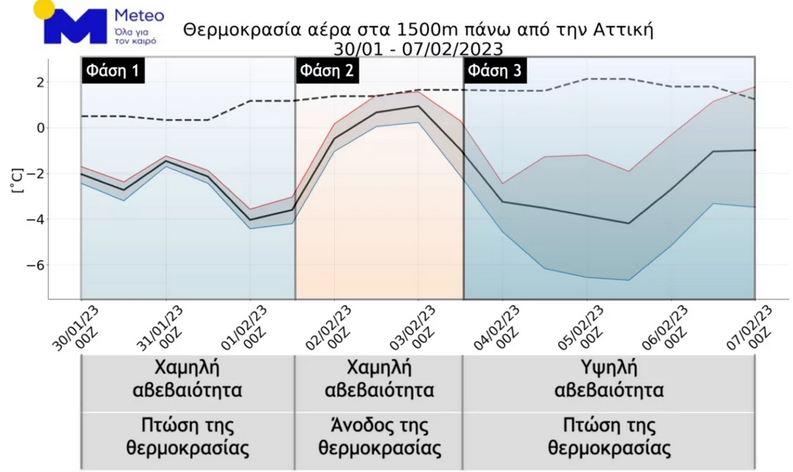 - Τέλος, η τρίτη φάση η οποία και χαρακτηρίζεται από υψηλή προγνωστική αβεβαιότητα αφορά το χρονικό διάστημα από τις μεσημβρινές ώρες της Παρασκευής 03/02 έως και τις βραδινές ώρες της Δευτέρας 06/02. Αυτή η περίοδος αναμένεται να χαρακτηριστεί από πτώση της θερμοκρασίας και αρχικά κατά τη διάρκεια της Παρασκευής από βροχοπτώσεις στα πεδινά και χιονοπτώσεις σε ορεινά και ημιορεινά τμήματα. Ωστόσο, σύμφωνα με το meteo.gr, η ένταση της πτώσης της θερμοκρασίας κατά τη διάρκεια του Σαββατοκύριακου 04-05/02 παραμένει εξαιρετικά αβέβαιη. Το ίδιο φυσικά ισχύει και για την πιθανότητα εκδήλωσης φαινομένων καθώς και τα πιθανά υψόμετρα χιονόπτωσης.