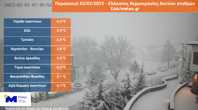 Από το meteo.gr δόθηκε και ο παρακάτω πίνακς με τις χαμηλότερες θερμοκρασίες που καταγράφηκαν το πρωί της Παρασκευής στη χώρα: