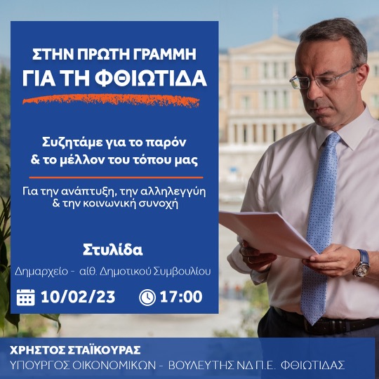 Στη Στυλίδα θα βρίσκεται την Παρασκευή 10 Φεβρουαρίου 2023 ο Υπουργός Οικονομικών και Βουλευτής Φθιώτιδας Χρήστος Σταϊκούρας, στο πλαίσιο του νέου κύκλου συναντήσεων στους Δήμους της περιφερειακής ενότητας.