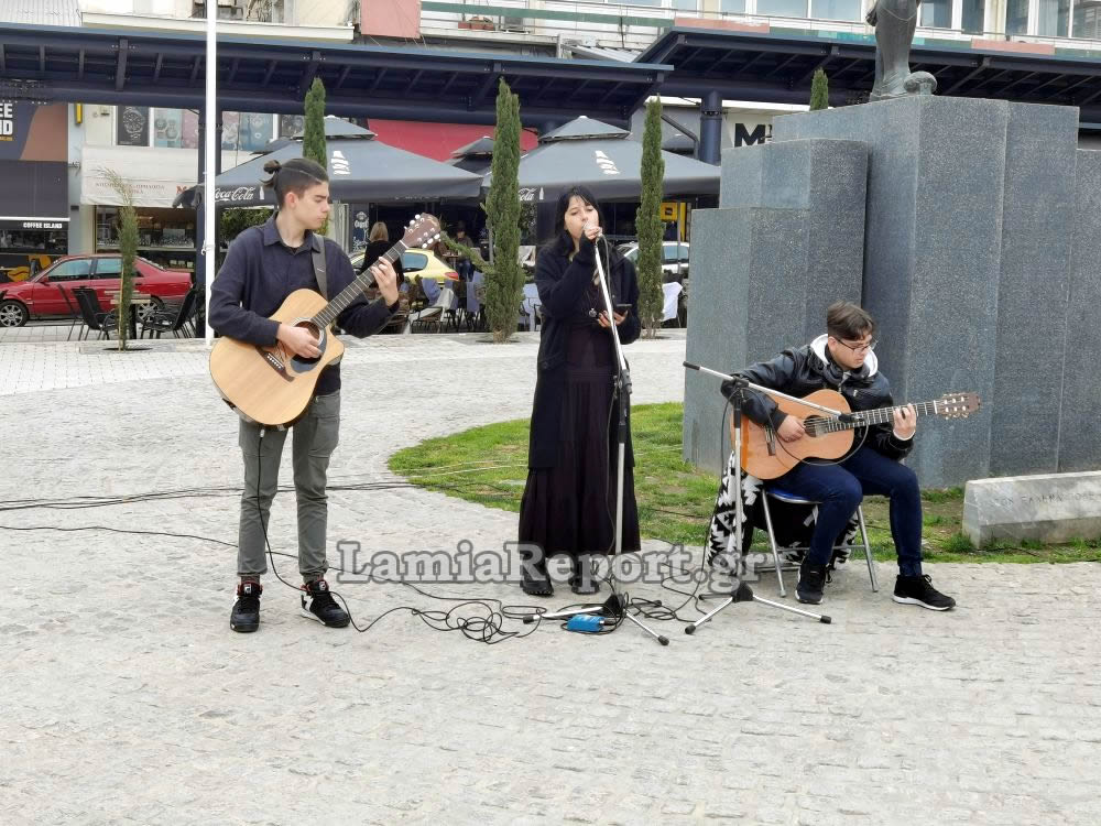 Το ραντεβού ήταν για τις 12:00’ το μεσημέρι της Πέμπτης (16/3) στην πλατεία Πάρκου. Τους συγκεντρωμένους υποδέχθηκαν με ένα τραγούδι οι μαθητές του Μουσικού Σχολείου Γιώργος Συράκης, Αποστολία Κουκουφίκη και Γιώργος Νικόπουλος.