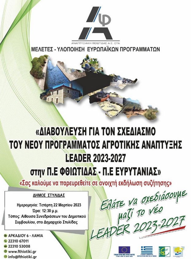 Ο Δήμος Στυλίδας σε συνεργασία με την ΟΤΔ «Αναπτυξιακή Φθιώτιδας Α.Ε. Ο.Τ.Α.» στο πλαίσιο προετοιμασίας του νέου προγράμματος LEADER προγραμματίζουν τις εξής ανοιχτές ενημερωτικές συναντήσεις στον Δήμο Στυλίδας, ως περιοχή παρέμβασης του υπό διαμόρφωση τοπικού προγράμματος, με εκπροσώπους δημόσιων φορέων, επιχειρήσεων, κοινωνικών επιχειρήσεων-φορέων, πολιτιστικών και περιβαλλοντικών συλλόγων, με ιδιώτες, νέους , γυναίκες, ανέργους, κα.