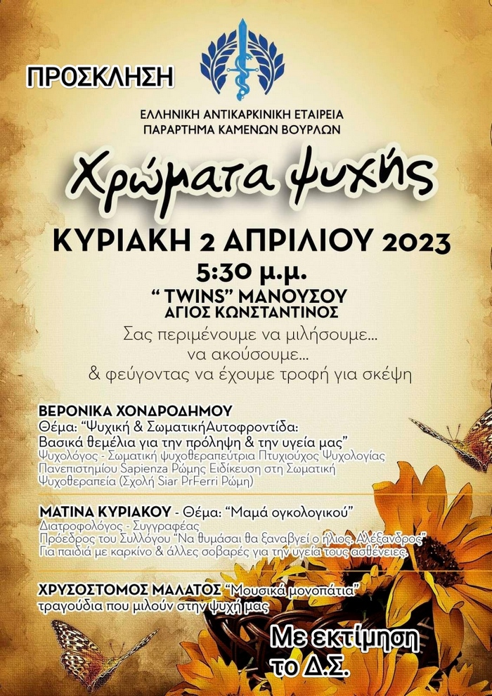 Εκδήλωση με τίτλο «Χρώματα Ψυχής» διοργανώνει το Παράρτημα Καμένων Βούρλων της Ελληνικής Αντικαρκινικής Εταιρείας την Κυριακή 2 Απριλίου 2023 στις 17:30, στο «Twins» Μανούσου στον Άγιο Κωνσταντίνο.