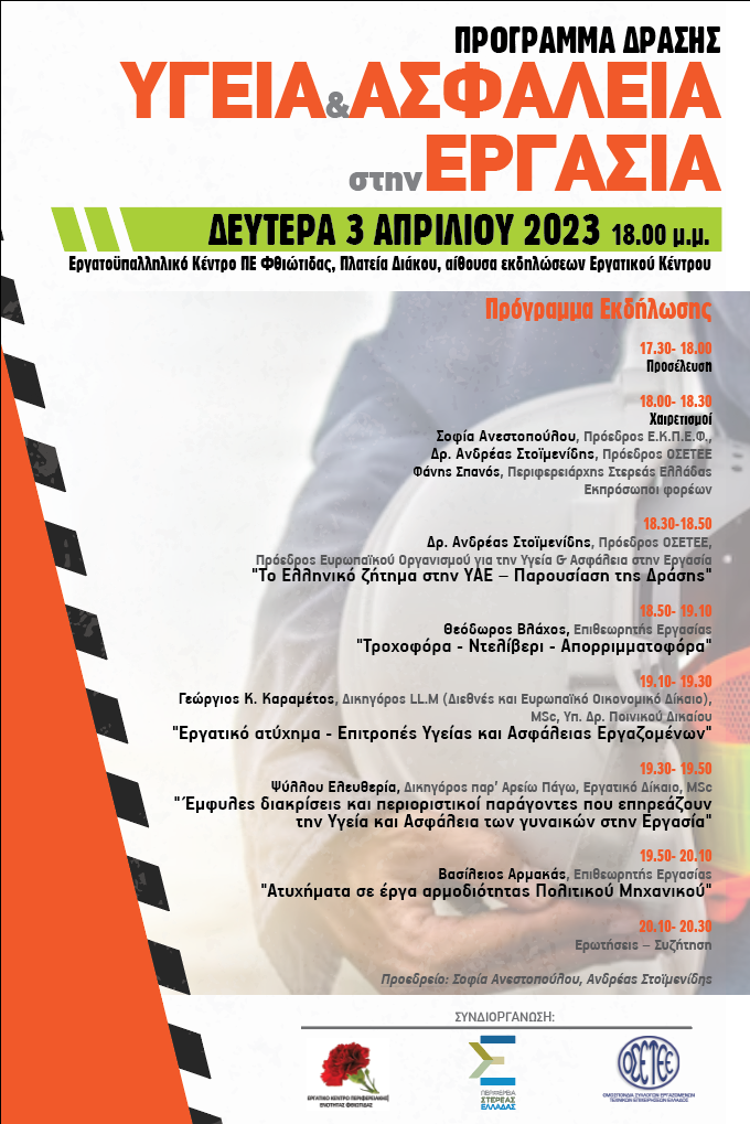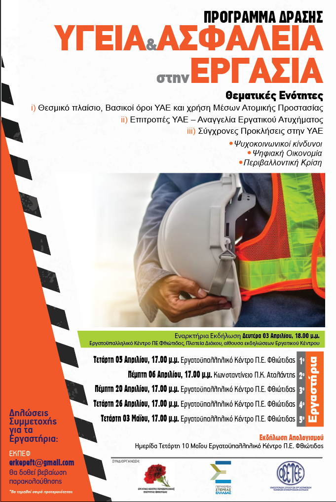Το Εργατοϋπαλληλικό Κέντρο Π.Ε. Φθιώτιδας (Ε.Κ.Π.Ε.Φ.), η Ομοσπονδία Συλλόγων Εργαζομένων Τεχνικών Επιχειρήσεων Ελλάδας (ΟΣΕΤΕΕ) και η Περιφέρεια Στερεάς Ελλάδας (Π.Σ.Ε.) στο πλαίσιο δράσης ενημέρωσης για την υγεία και ασφάλεια στην εργασία, διοργανώνουν την Δευτέρα 3 Απριλίου και ώρα 18:00 στην αίθουσα εκδηλώσεων του Εργατοϋπαλληλικού Κέντρου (Πλ. Διάκου, Λαμία) την εναρκτήρια εκδήλωση της δράσης με θέμα: «Υγεία και ασφάλεια στην εργασία».