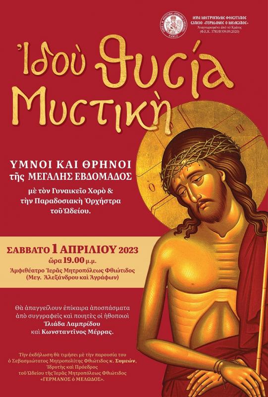 Ἡ Ἱερά Μητρόπολις Φθιώτιδος, ἐν ὄψει τῆς ἑορτῆς τοῦ Πάσχα, σᾶς προσκαλεῖ στήν ἐκδήλωση «Ἰδού θυσία Μυστική», ἡ ὁποία θὰ πραγματοποιηθεῖ αὔριο, Σάββατο 1η Ἀπριλίου, καὶ ὣρα 19:00 μ.μ. στὸ Ἀμφιθέατρο τοῦ Πνευματικοῦ καί Διοικητικοῦ Κέντρου τῆς Ἱερᾶς Μητροπόλεως Φθιώτιδος στή Νέα Ἄμπλιανη Λαμίας.