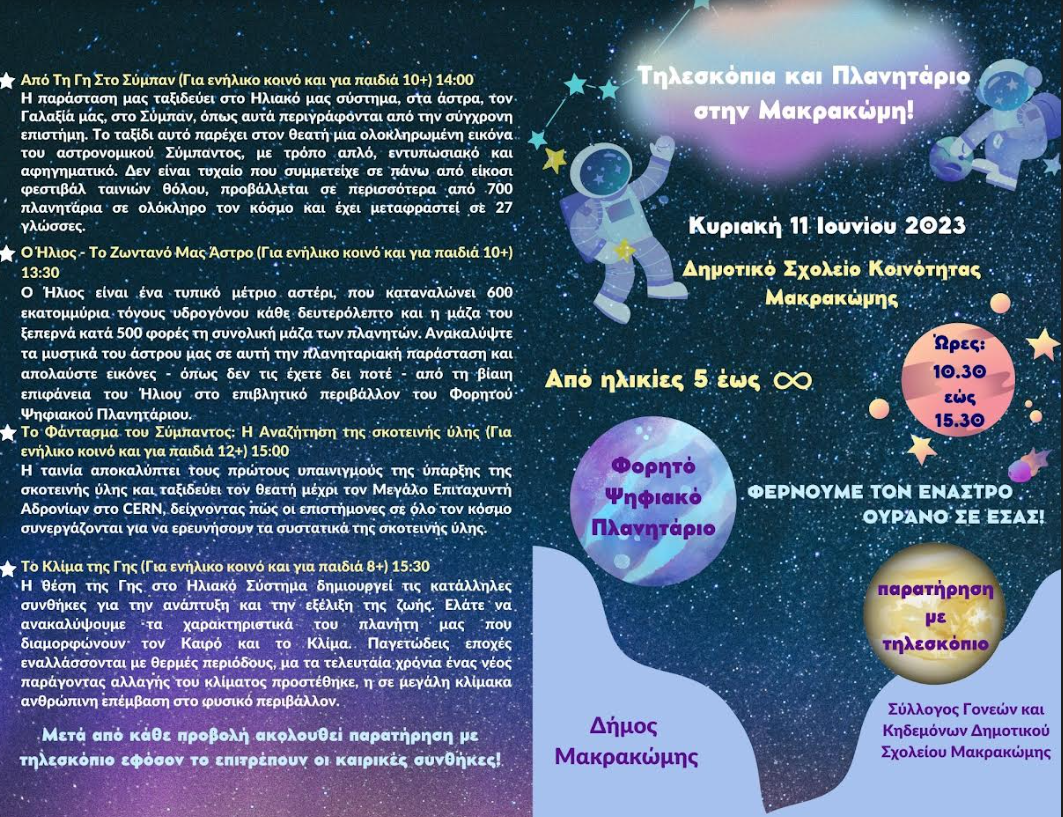Την Κυριακή 11 Ιουνίου 2023 και ώρες 10:00 - 15:30, στον προαύλιο χώρο του Δημοτικού Σχολείου Μακρακώμης, θα φιλοξενήσουμε το Φορητό Ψηφιακό Πλανητάριο, σε συνεργασία με τον Σύλλογο Γονέων και Κηδεμόνων του Δημοτικού Σχολείου Μακρακώμης.