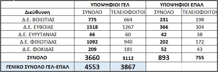 Από αυτούς οι 1.294 είναι από τη Φθιώτιδα, σύμφωνα με τα τελικά στοιχεία και συγκεκριμένα 1.092 στα ΓΕΛ και 202 στα ΕΠΑΛ.