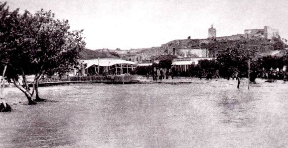 Η παραπάνω φωτογραφία-ντοκουμέντο λήφθηκε το πρωί της επομένης ή μεθεπομένης ημέρας 5 ή 6 Ιουνίου 1907. Διακρίνουμε τις ζημιές που έχει υποστεί το υπόστεγο του καφενείου «Η Ένωσις» στην συμβολή των οδών Αμαλίας και Ηπείρου (νυν Στέφανου Σαράφη). Τέλος κάποιες ανθρώπινες φιγούρες προσπαθούν να διασχίσουν τους πλημμυρισμένους δρόμους. Οι περιοχές γύρω από το Φρούριο (που μαζί με το παλαιό οθωμανικό ρολόι διακρίνονται καθαρά) είναι οι μόνες που δεν επλήγησαν από την καταστροφική πλημμύρα.