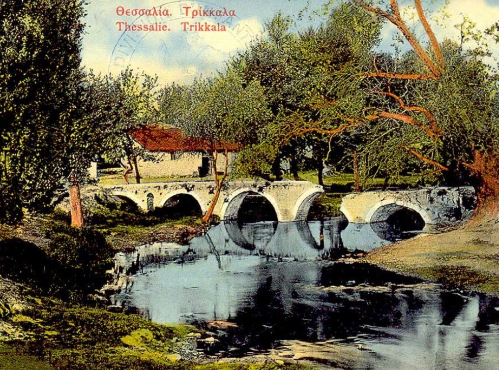Η παραπάνω φωτογραφία έχει ληφθεί από την κεντρική γέφυρα της πόλης. Η γέφυρα του «Πίχτου» στα Τρίκαλα, μετά την καταστροφική πλημμύρα του Ληθαίου ποταμού το 1907 που την έχει «πληγώσει», φωτογραφημένη από τον Στέφανο Στουρνάρα. Όπως βλέπουμε, το κεντρικό της τόξο είναι κατεστραμμένο, ενώ ρωγμές διακρίνουμε και στα άλλα τόξα της γέφυρας. Τα επόμενα χρόνια οι ρωγμές αυτές θα επιδεινωθούν. Μια πρόχειρη ξύλινη κατασκευή θα στηθεί πατώντας πάνω στις βάσεις των τόξων της προκειμένου να συνεχισθεί η επικοινωνία ανάμεσα στα δύο τμήματα της πόλης. Η καρτ ποστάλ από την δεύτερη σειρά των επιχρωματισμένων του Βολιώτη φωτογράφου και εκδότη κυκλοφόρησε γύρω στα 1910.