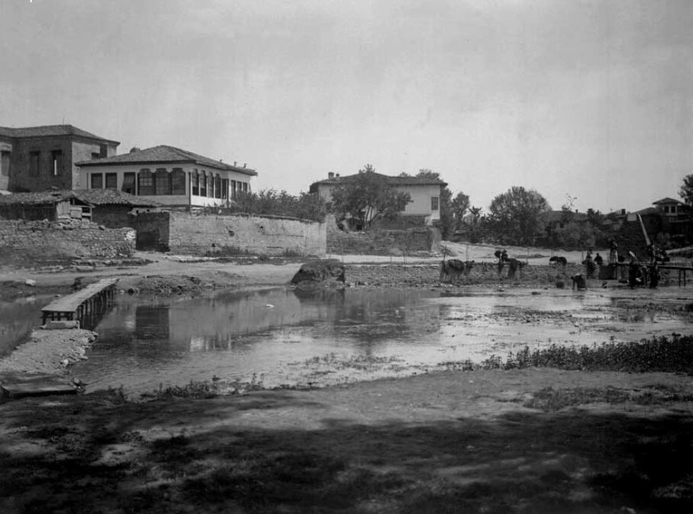 Εξαιρετική φωτογραφία των Τρικάλων στα 1904 με πρώτο πλάνο το ανάντι του ποταμού Ληθαίου. Σημείο προσανατολισμού είναι η οκτάκρουνη βρύση της Γούρνας που είχε κατασκευαστεί από τον Δήμαρχο Κωνσταντίνο Ραδινό λίγα χρόνια μετά την Απελευθέρωση της πόλης . Δίπλα της διακρίνουμε ακόμη την ξύλινη κατασκευή που τότε δεν ήταν άλλη από την αρχική γέφυρα της Γούρνας και εξυπηρετούσε την διέλευση των πεζών κατά τους θερινούς μήνες. Δεξιά μια ακόμη πρόχειρη ξύλινη κατασκευή για την διέλευση του ποταμού από τους πεζούς, παρακείμενη του σημείου όπου σήμερα έχει κατασκευαστεί η γέφυρα Βούλγαρη στην πλατεία Βουβής. Το εξαιρετικά καλαίσθητο και μεγαλόπρεπο κτίριο είναι πιθανότατα η τότε Επισκοπή Τρικάλων. Στο στιγμιότυπο Τρικαλινές πλένουν τα στρωσίδια τους στα νερά του ποταμού και στη συνέχεια τα απλώνουν για στέγνωμα στο παρακείμενο τοιχίο.