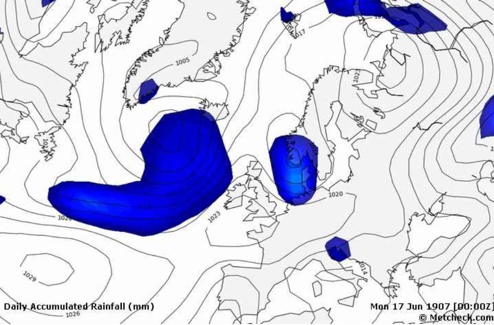 Το αβαθές βαρομετρικό χαμηλό πάνω από την Ελλάδα. Η ημερομηνία 4 Ιουνίου ήταν με το παλαιό ημερολόγιο άρα με το νέο 17 Ιουνίου 1907