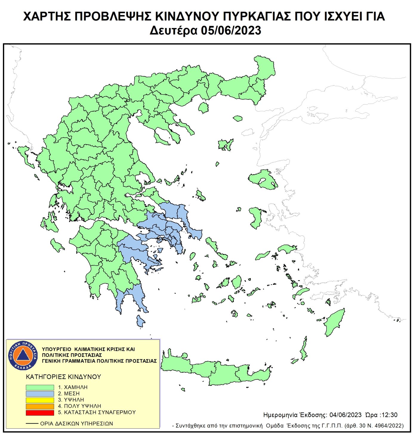 Για πρώτη φορά το διήμερο 4-5 Ιουνίου παρουσιάζει στην ηπειρωτική χώρα επικινδυνότητα επιπέδου 2 (με μπλε χρώμα), με το χαρακτηρισμό ως μέση κατηγορία κινδύνου.