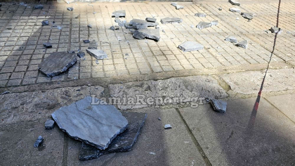Συγκεκριμένα στη συμβολή των οδών Θερμοπυλών και Παλαιολόγου, ξεκόλλησαν μεγάλα κομμάτια μαρμάρων-γρανίτη, που έπεσαν με δύναμη στο πεζοδρόμιο και στο δρόμο.
