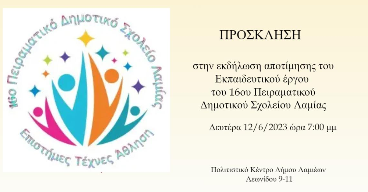 Τη Δευτέρα 12/6/2023 και ώρα 7:00 μμ, στο Πολιτιστικό Κέντρο του Δήμου Λαμιέων (οδός Λεωνίδου), θα πραγματοποιηθεί εκδήλωση συνολικής αποτίμησης του εκπαιδευτικού έργου του 16ου Πειραματικού Δημοτικού Σχολείου Λαμίας.