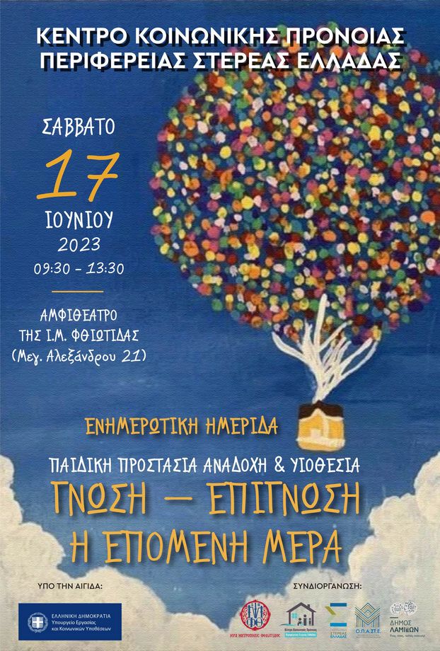 Μια πολύ ενδιαφέρουσα ημερίδα διοργανώνει το Κέντρο Κοινωνικής Πρόνοιας Περιφέρειας Στερεάς Ελλάδας με θέμα «Παιδική Προστασία - Αναδοχή & Υιοθεσία: Γνώση - Επίγνωση - Η Επόμενη Ημέρα», το Σάββατο 17 Ιουνίου 2023 και ώρες 09:30’ έως 13:30’ στο Αμφιθέατρο της Ιεράς Μητρόπολης Φθιώτιδας (Μεγάλου Αλεξάνδρου 21), με συνδιοργανωτές την Ι.Μ. Φθιώτιδος, την Περιφέρεια Στερεάς Ελλάδας, τον ΟΠΑΣΤΕ και το Δήμο Λαμιέων, υπό την αιγίδα του Υπουργείου Εργασίας και Κοινωνικών Υποθέσεων.