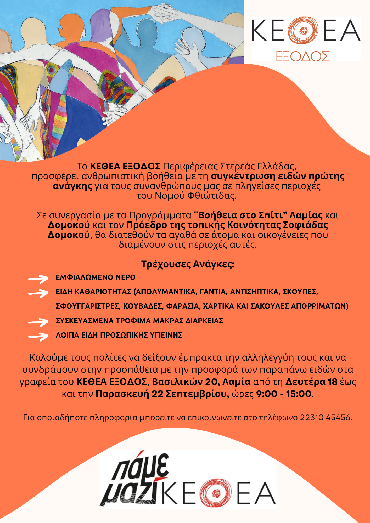 Για την κάλυψη των αναγκών των συνανθρώπων μας σε πληγείσες περιοχές του Νομού Φθιώτιδας από τα πρόσφατα ακραία καιρικά φαινόμενα, το ΚΕΘΕΑ ΕΞΟΔΟΣ Περιφέρειας Στερεάς Ελλάδας με έδρα τη Λαμία, προσφέρει ανθρωπιστική βοήθεια με τη συγκέντρωση ειδών πρώτης ανάγκης.