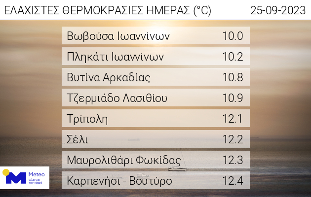 Δείτε παρακάτω και τις χαμηλότερες θερμοκρασίες από το δίκτυο αυτόματων μετεωρολογικών σταθμών του meteo.gr: