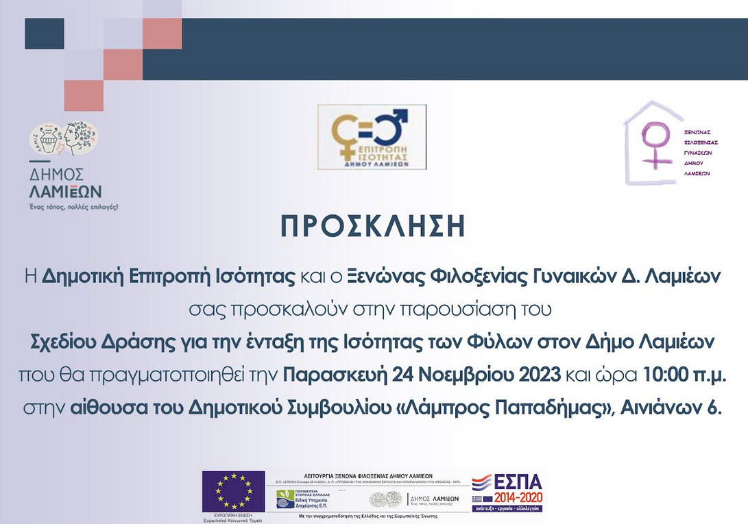 Η Δημοτική Επιτροπή Ισότητας και ο Ξενώνας Φιλοξενίας Γυναικών Δ. Λαμιέων, σας προσκαλούν στην παρουσίαση του σχεδίου δράσης για την ένταξη της Ισότητας των φύλων στον Δήμο Λαμιέων, που θα πραγματοποιηθεί την Παρασκευή 24 Νοεμβρίου, στις 10:00' το πρωί, στην αίθουσα του Δημοτικού Συμβουλίου "Λάμπρος Παπαδήμας" (Αινιάνων 6).