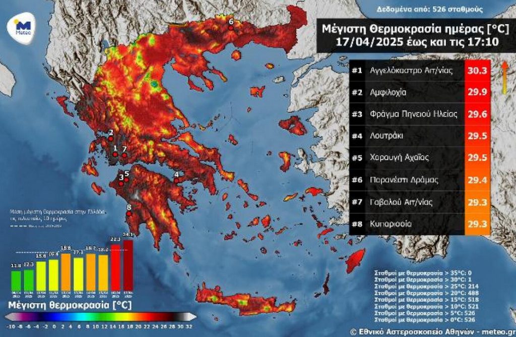 Στον παρακάτω χάρτη αποτυπώνονται οι μέγιστες θερμοκρασίες έως τις 17:10 της Μεγάλης Πέμπτης 17/04, ενώ στον πίνακα παρουσιάζονται οι 8 υψηλότερες μέγιστες τιμές από 526 μετεωρολογικούς σταθμούς του δικτύου αυτόματων μετεωρολογικών σταθμών του Εθνικού Αστεροσκοπείου Αθηνών / meteo.gr.