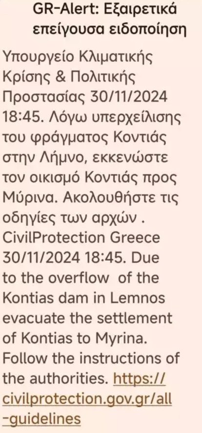 «Λόγω υπερχείλισης του φράγματος Κοντιάς στη Λήμνο, εκκενώστε τον οικισμό Κοντιάς προς Μύρινα. Ακολουθήστε τις οδηγίες των αρχών», έγραφε το μήνυμα του 112.