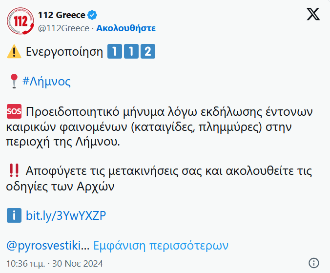 Αυτό μάλιστα είναι το 2ο μήνυμα του 112 που στέλνετε σήμερα στη Λήμνο.