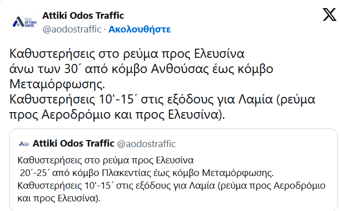 άνω των 30΄ από κόμβο Ανθούσας έως κόμβο Μεταμόρφωσης.
