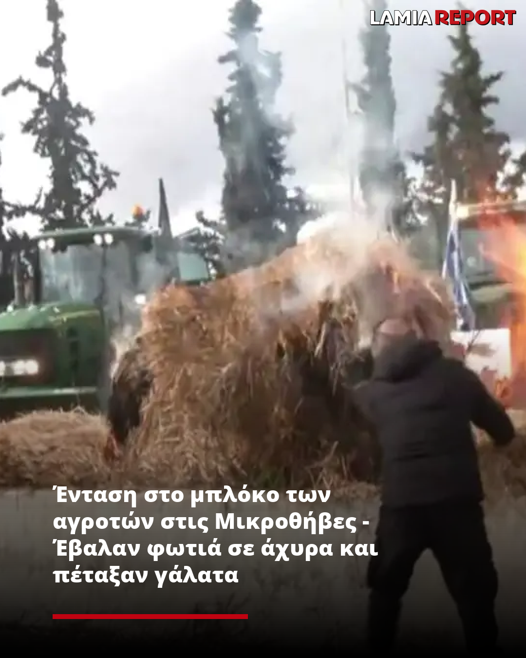 Ένταση στο μπλόκο των αγροτών στις Μικροθήβες - Έβαλαν φωτιά σε άχυρα και πέταξαν γάλατα