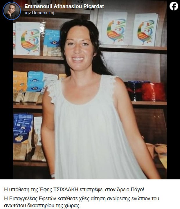 «Η υπόθεση της Έφης ΤΣΙΧΛΑΚΗ επιστρέφει στον Άρειο Πάγο! Η Εισαγγελέας Εφετών κατέθεσε χθες αίτηση αναίρεσης ενώπιον του ανωτάτου δικαστηρίου της χώρας.