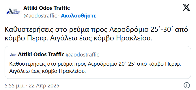 Προβλήματα στην κυκλοφορία, καταγράφονται το απόγευμα της Τρίτης (22/4/25) και στην Αττική Οδό, στο ρεύμα προς αεροδρόμιο. Οι καθυστερήσεις φτάνουν τα 30 λεπτά.