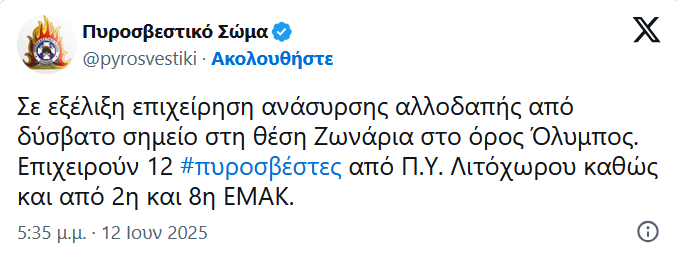Σύμφωνα με την Πυροσβεστική, η γυναίκα βρίσκεται σε δύσβατο σημείο στη θέση Ζωνάρια. Στο σημείο επιχειρούν 12 πυροσβέστες από την Πυροσβεστική Λιτόχωρου καθώς επίσης και από την 2η και 8η ΕΜΑΚ.