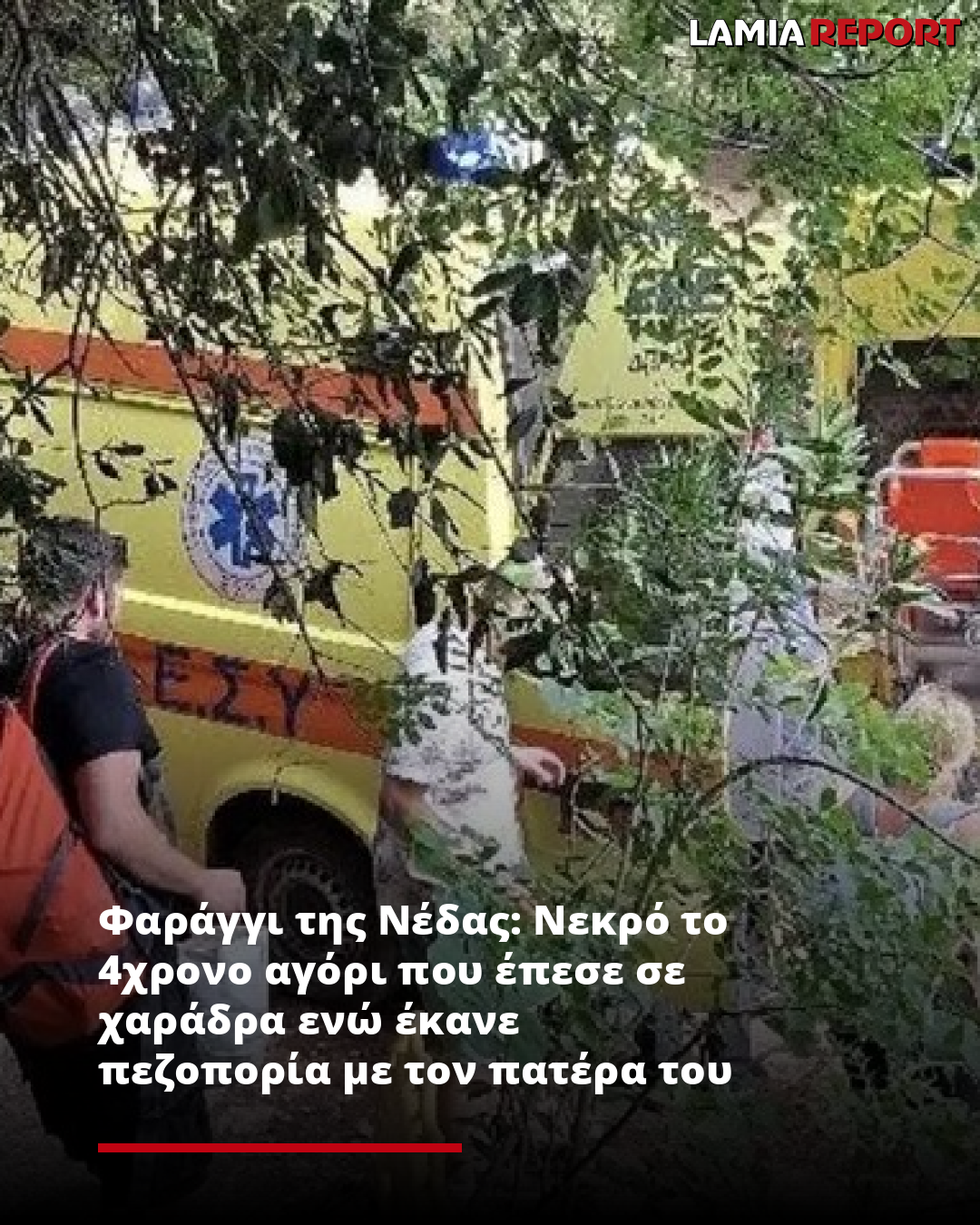 Σε τραγωδία μετατράπηκε η εκδρομή για την οικογένεια από τη Γερμανία καθώς ο 4χρονος γιος που είχε τραυματιστεί σοβαρά όταν κατέπεσε μαζί με τον πατέρα του σε χαράδρα, κατά τη διάρκεια πεζοπορίας στο φαράγγι της Νέδας, στα σύνορα Ηλείας και Μεσσηνίας.