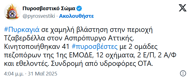 Οι ισχυροί άνεμοι που πνέουν σήμερα (31.05.2025) σε ολόκληρη την Ελλάδα δυστυχώς ευνοούν την εκδήλωση φωτιάς. Λίγο μετά τις 15:30, η πυροσβεστική δέχθηκε κλήση για πυρκαγιά στον Ασπρόπυργο.