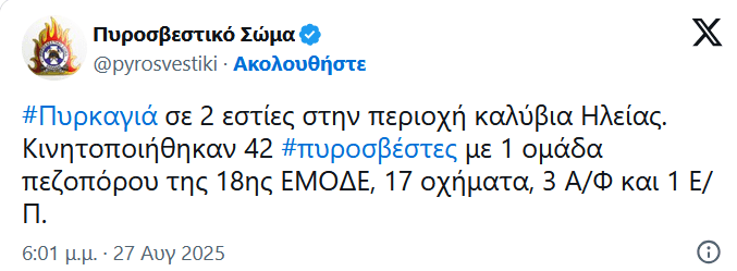 Πυρκαγιά ξέσπασε το απόγευμα (28/08/2025) στην περιοχή Καλύβια Ηλείας. Η πυρκαγιά στα Καλύβια Ηλείας, σύμφωνα με την πυροσβεστική, έχει δύο ενεργές εστίες.