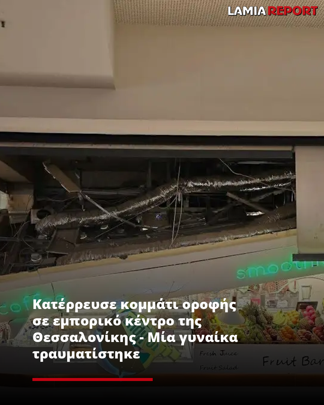 Στο εμπορικό κέντρο, στην περιοχή της Πυλαίας στη Θεσσαλονίκη, κατέρρευσε τμήμα της οροφής καταστήματος εστίασης, τραυματίζοντας μια 45χρονη γυναίκα, την ώρα που στον χώρο βρισκόταν πολύς κόσμος.