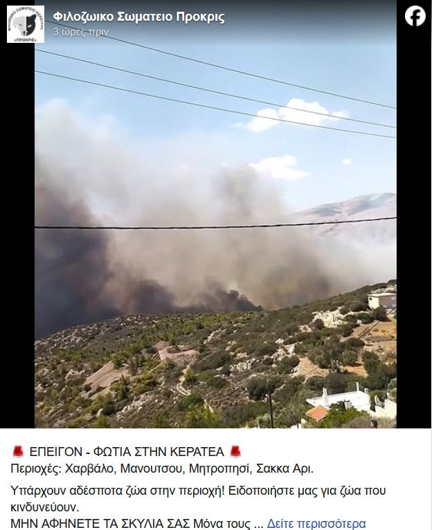 Ο πυροσβέστης έβρεξε με λίγο νερό το σκυλάκο που βρέθηκε μόνο του στα πύρινα μέτωπα που καίνε. Στο μεταξύ, όπως γράφει το newsit.gr, το φιλοζωικό σωματείο Κερατέας «Προκρίς», απευθύνει έκκληση μέσω της επίσημης σελίδας τους στο Facebook