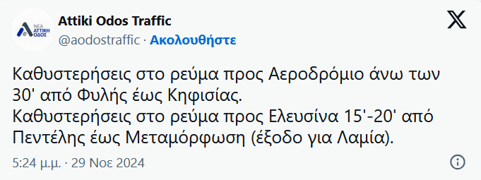 Παράλληλα, καθυστερήσεις σημειώνονται και στην Αττική οδό, όπου επίσης επικρατεί δυσχέρεια της κυκλοφορίας, κυρίως στο ύψος της Μεταμόρφωσης.