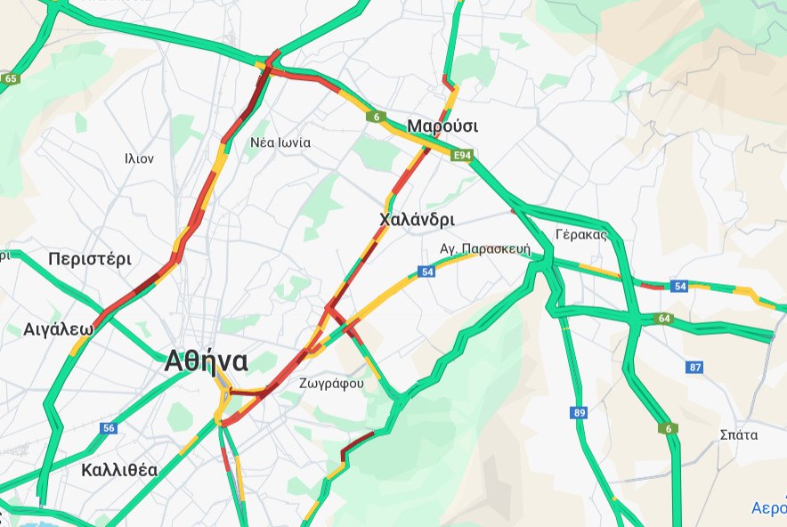 Χαμηλές είναι, επίσης, οι ταχύτητες των αυτοκινήτων στον Κηφισό από τη Μεταμόρφωση μέχρι το Αιγάλεω και στις δύο κατευθύνσεις. Πυκνή ροή της κίνησης παρατηρείται ακόμη στην παραλιακή Λεωφόρο Ποσειδώνος από Γλυφάδα προς Άλιμο.