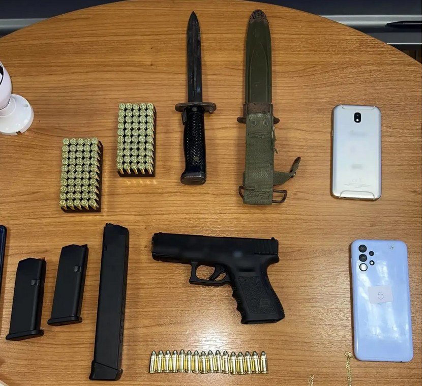 πυροβόλο όπλο, με μήκος κάνης 17 εκατοστά, 3 γεμιστήρες, 116 φυσίγγια, ξιφολόγχη στρατιωτικού τύπου, συνολικού μήκους 28,5 εκατοστά και συνολικό μήκος λάμας 17 εκατοστά, 57 κοσμήματα χρυσού χρώματος (αλυσίδες και κολιέ με μενταγιόν, δαχτυλίδια, βέρες, σκουλαρίκια (σε ζεύγη), βραχιόλια), 8 κινητά τηλέφωνα, καταγραφικό μηχάνημα κλειστού κυκλώματος παρακολούθησης και 7 κάμερες και το χρηματικό ποσό των 675 ευρώ.