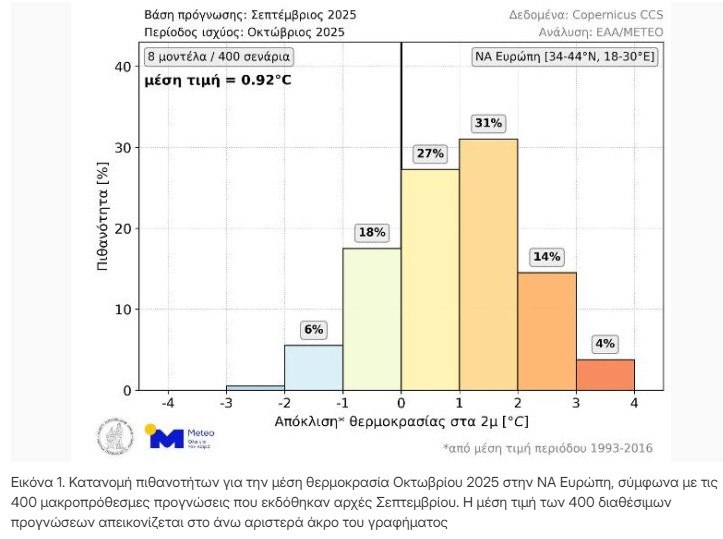 Θερμότερος του κανονικού αναμένεται να είναι ο ερχόμενος Οκτώβριος στην ΝΑ Ευρώπη (συμπεριλαμβανομένης της Ελλάδας) σύμφωνα με τις μακροπρόθεσμες προγνώσεις που εκδόθηκαν στις αρχές Σεπτεμβρίου. Όπως φαίνεται στο παρακάτω γράφημα (Εικόνα 1), σύμφωνα με το 76% των διαθέσιμων σεναρίων η μέση θερμοκρασία Οκτωβρίου θα είναι υψηλότερη από τα κανονικά για την εποχή επίπεδα (περίοδος αναφοράς: 1993-2016).