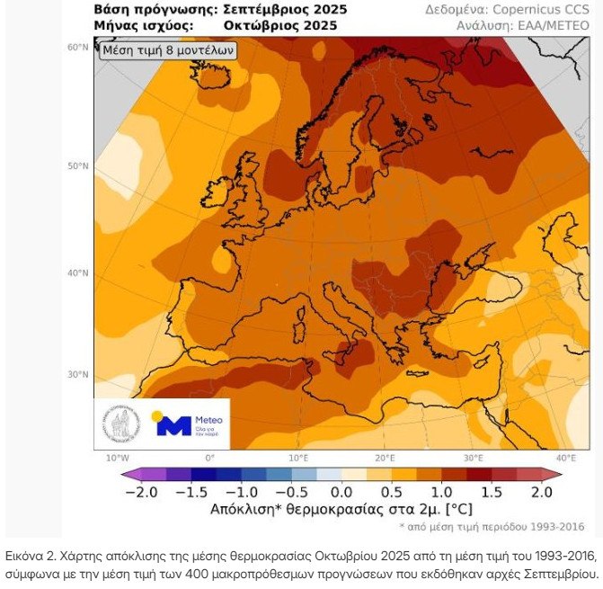 Συνολικά για την ευρωπαϊκή ήπειρο, ο χάρτης της Εικόνας 2 απεικονίζει την απόκλιση της μέσης θερμοκρασίας Οκτωβρίου με βάση την μέση τιμή των 400 σεναρίων. Όπως προκύπτει, θετικές αποκλίσεις αναμένονται σε όλη την ήπειρο, με τις μεγαλύτερες τιμές να εντοπίζονται στην ΒΑ Ευρώπη και τα Βαλκάνια όπου ξεπερνούν τον +1°C.