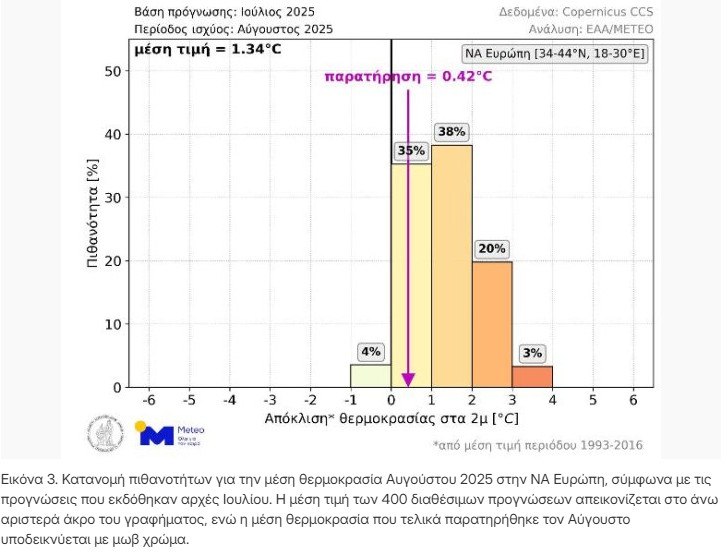 Όσον αφορά τον περασμένο Αύγουστο, η μέση θερμοκρασιακή απόκλιση στην ΝΑ Ευρώπη ήταν +0.42°C, ενώ η μέση τιμή όλων των σεναρίων της μακροπρόθεσμης πρόγνωσης που εκδόθηκε τον Ιούλιο του 2025 ήταν +1.34°C. Όπως φαίνεται στο παρακάτω γράφημα (Εικόνα 3), το μέγεθος της απόκλισης που παρατηρήθηκε είχε πιθανότητα 35% και ήταν το 2ο πιθανότερο πεδίο τιμών στην μακροπρόθεσμη πρόγνωση.